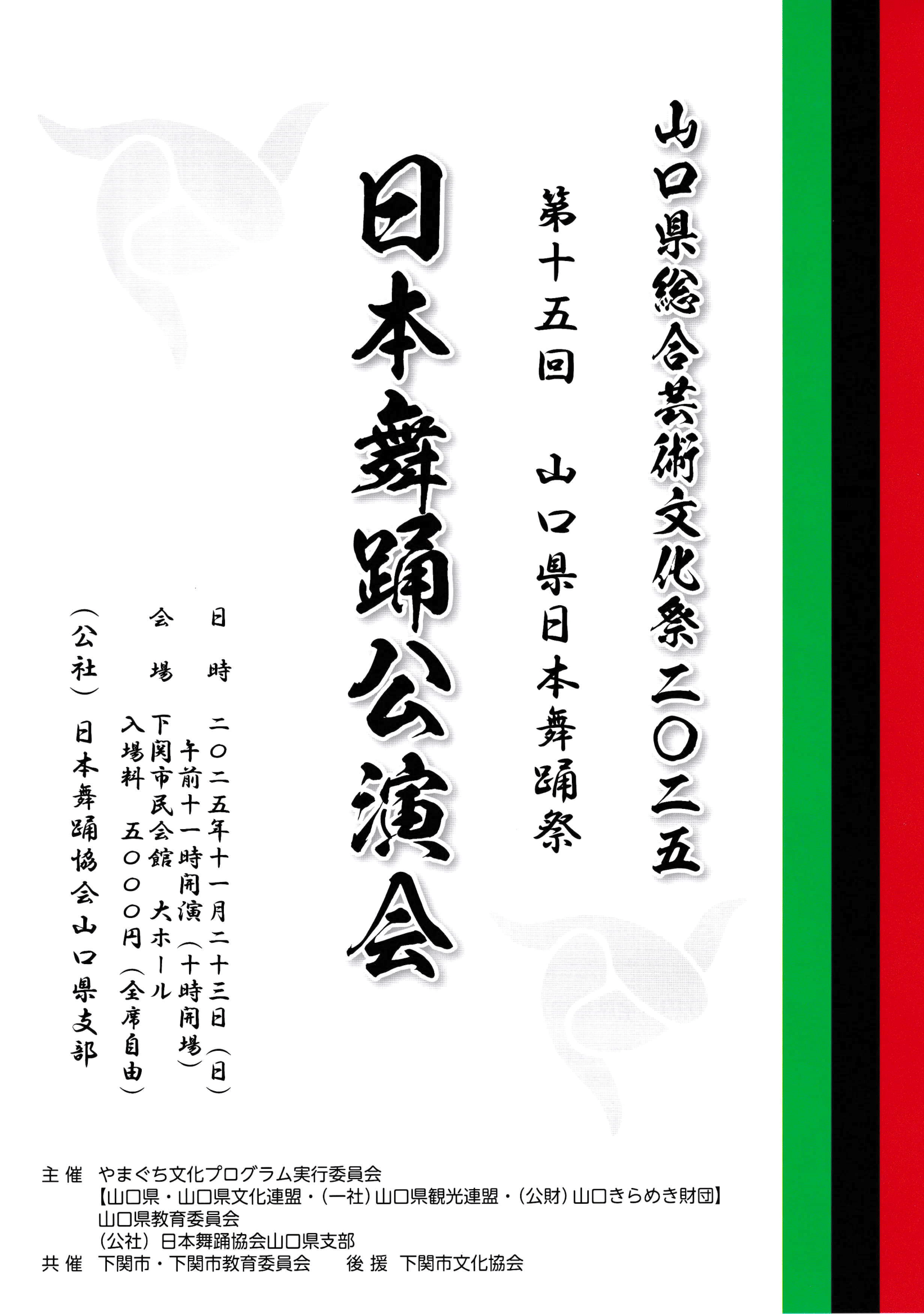 | 主催 | やまぐち文化プログラム実行委員会 【山口県・山口県文化連盟・(一社)山口県観光連盟・(公財)山口きらめき財団】 山口県教育委員会 (公社)日本舞踊協会山口県支部 |