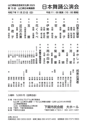 | 主催 | やまぐち文化プログラム実行委員会【山口県、山口県文化連盟、(一社)山口県観光連盟、(公財)山口きらめき財団】、山口県教育委員会 (公社)日本舞踊協会山口県支部、周南市邦舞連盟 |